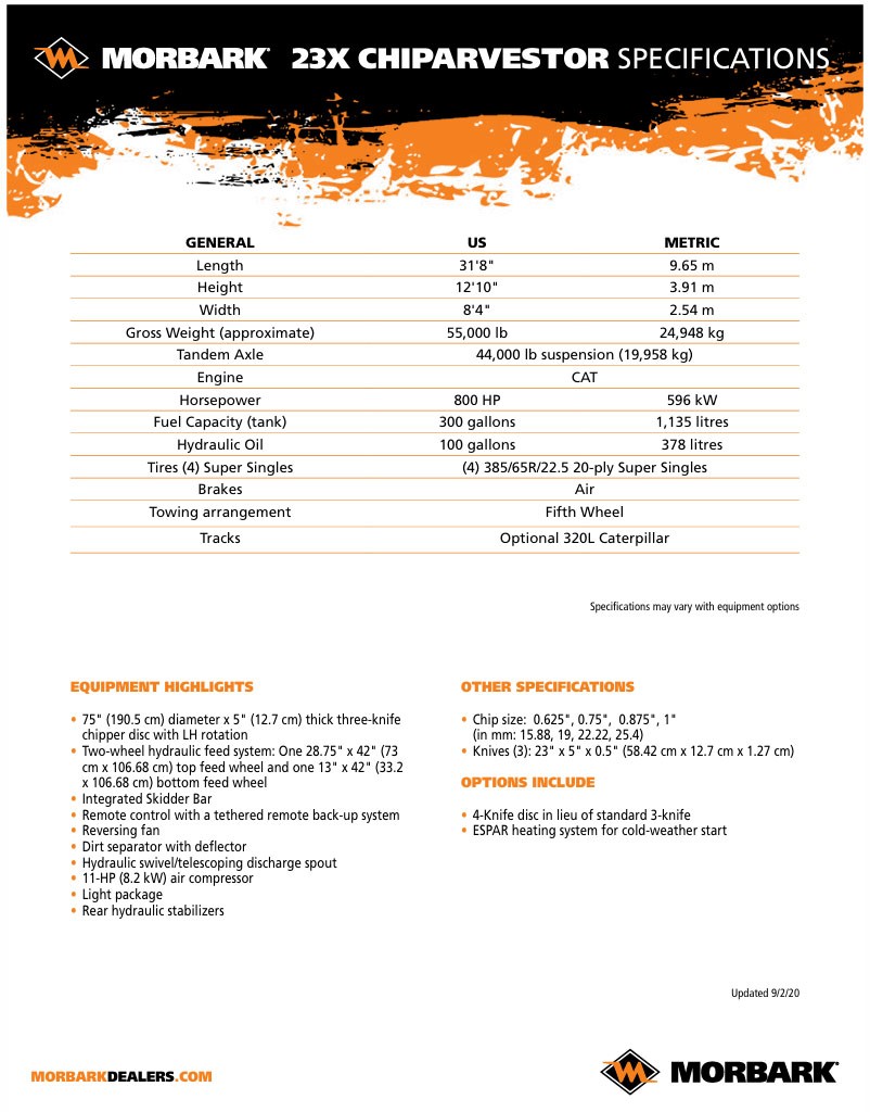 Available now, NEW and UNUSED Morbark 23X Chiparvestor chipper from 2023 with 0 hours. This Morbark 23X Chiparvestor comes with a CAT engine with EPA and is unused. The Morbark 23X utilizes a robust 75-inch (190.5 cm) diameter x 5-inch (12.7 cm) thick chipper disc, designed for efficient wood chipping. Additionally, it features an integrated dirt separator with a deflector, ensuring the cleanliness of the final product. The Morbark 23X boasts significant advancements over previous models, including improved ground clearance with four super single flotation tires, allowing for seamless mobility on rugged logging sites. With a width of 8’4″ (2.54 m), it ensures legal transport globally, making it highly versatile for various applications. The machine’s simplified feed system includes a two-wheel hydraulic feed system with a 28.75-inch x 42-inch (73 cm x 106.68 cm) top feed wheel and a 13-inch x 42-inch (33.2 cm x 106.68 cm) bottom feed wheel, enhancing operational efficiency. This powerhouse machine is perfect for a wide range of forestry applications, including timber harvesting, land clearing, and biomass production. Its spacious work platform provides easier and safer disc inspections and maintenance, adding to its user-friendly design. The Morbark 23X is engineered to handle the toughest jobs with ease, making it an invaluable asset for your forestry operations. The machine is direct available.